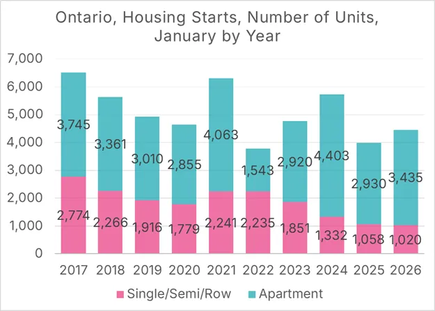 Ground‑oriented homes – single‑detached, semis and rows – fell to just 1,020 units, the lowest January on record since 1990. Annualized, total starts sat under 54,000, roughly 30% of Ontario’s 175,000‑unit annual goal.