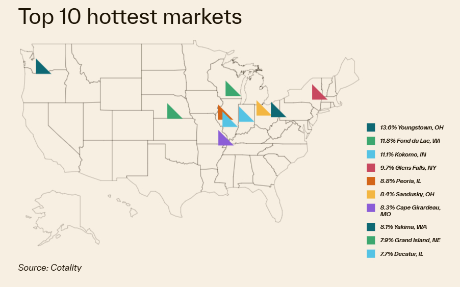 Cotality’s “Top 10 hottest markets” chart put Youngstown in first place (13.6%), followed by Fond du Lac, Wisconsin (11.8%); Kokomo, Indiana (11.1%); Glens Falls, New York (9.7%); Peoria, Illinois (8.8%); Sandusky, Ohio; Cape Girardeau, Missouri; Yakima, Washington; Grand Island, Nebraska; and Decatur, Illinois. These metros all logged some of the strongest year‑over‑year price gains in the country, according to the index.
